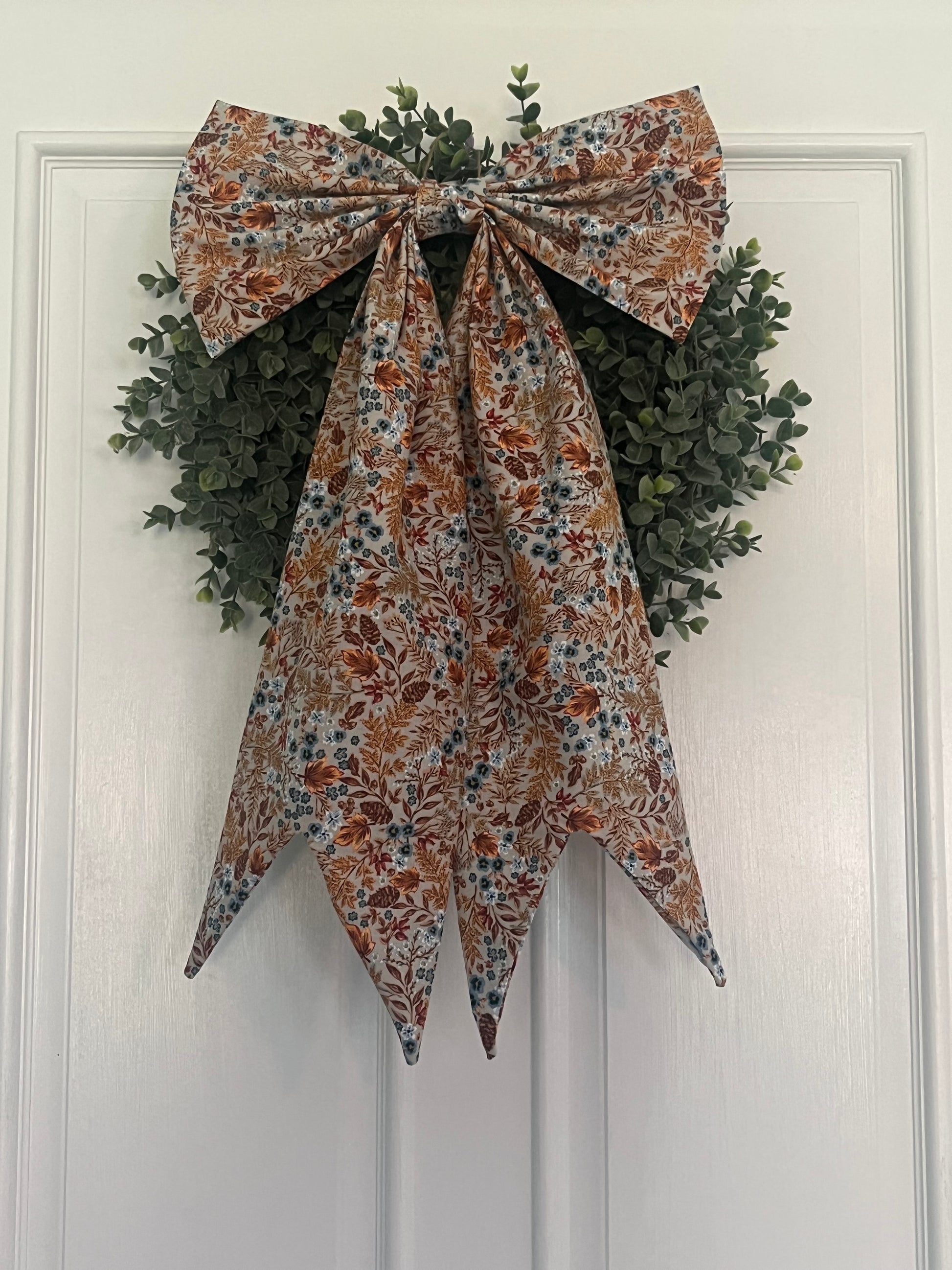 Rich burnt orange and golden leaves rest on a soft taupe background, accented with little blue flowers—like a crisp fall sky through the trees. Cozy, whimsical, and full of autumn charm. 🍂💙