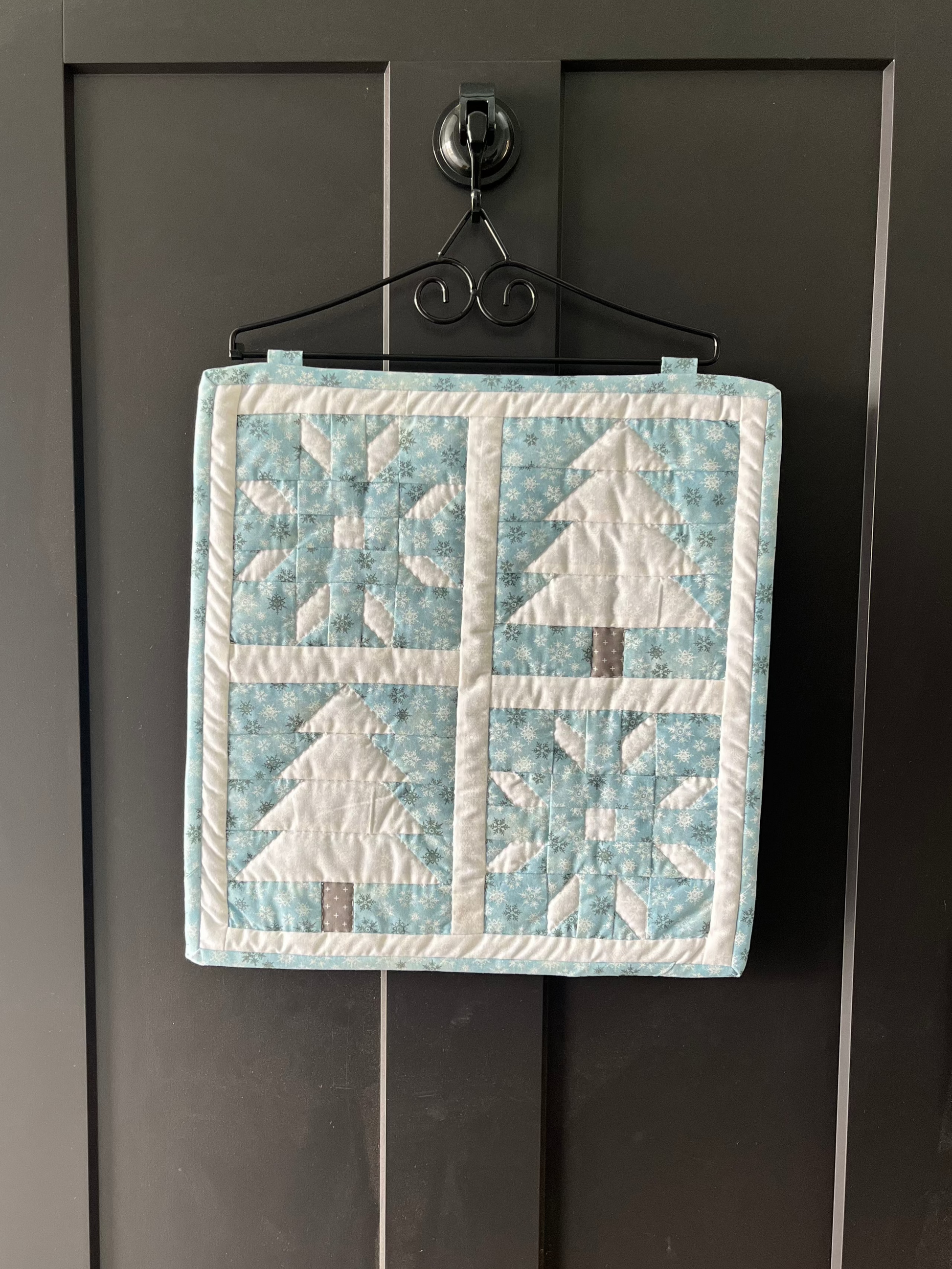 Approximately 17x17 Winter Wall Hanging. Machine sewn and hand quilted with cotton fabric. Comes with a black decorative hanger.